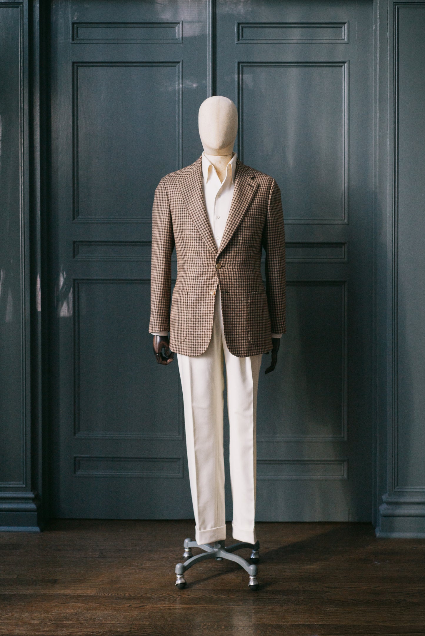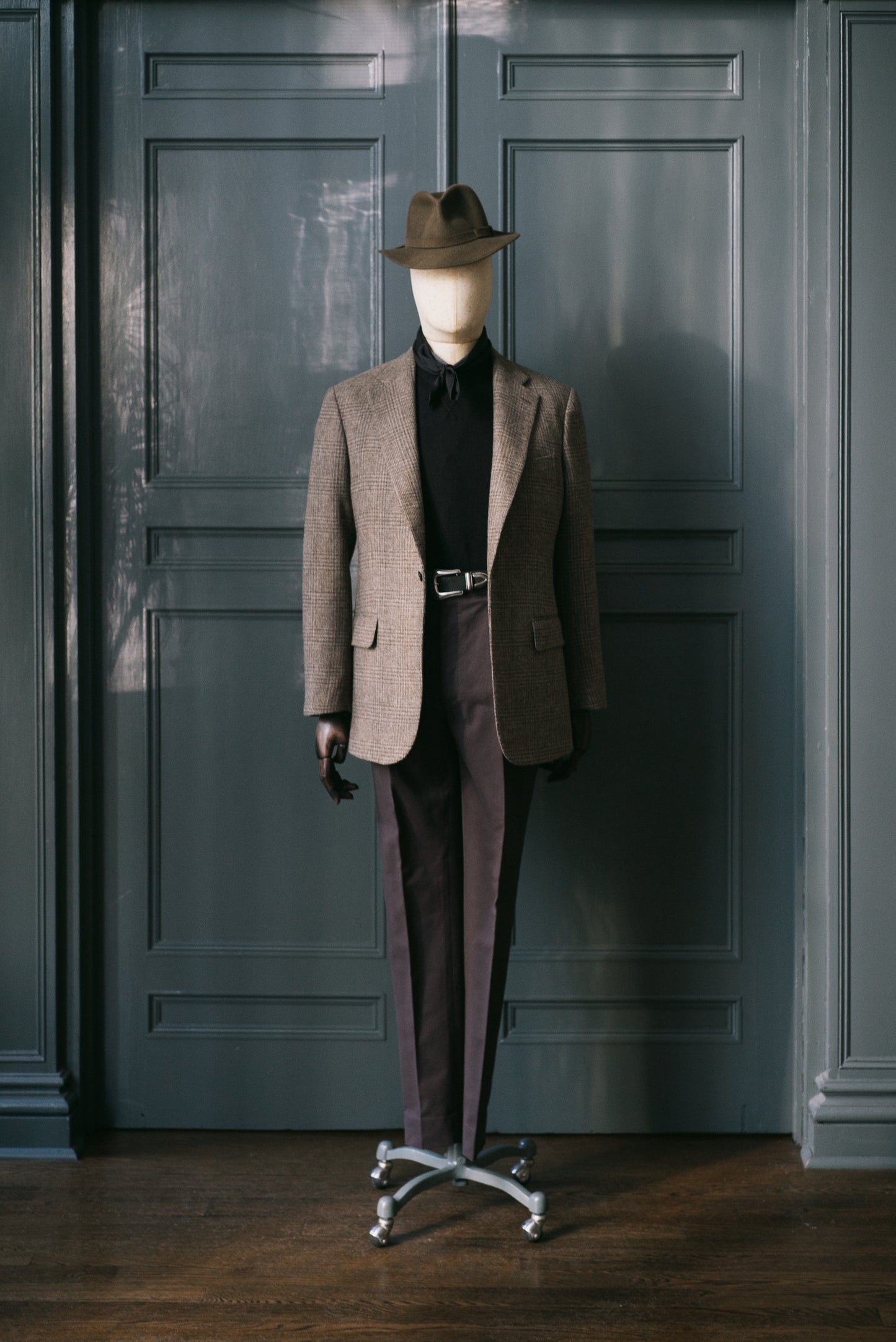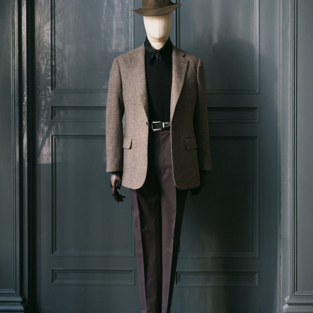 For our 2025 recreation, we opted for a grayish brown glen check sports coat with fabric from Dugdale Bros & Co.’s Winter Jacketing bunch, (COL009), 11oz/320gr. It is a one button single breasted design, with straight pocket flaps and a 3 3/4” or 9.5cm wide lapel. We paired it with grey cotton twill flat front trousers, and a charcoal denim shirt made using Thomas Mason shirting cloth (FM304595-9900-B). The look came together with our Cad & The Dandy black Geelong wool college sweater. The hat is G.Bruce Boyer’s own Tyrollean.