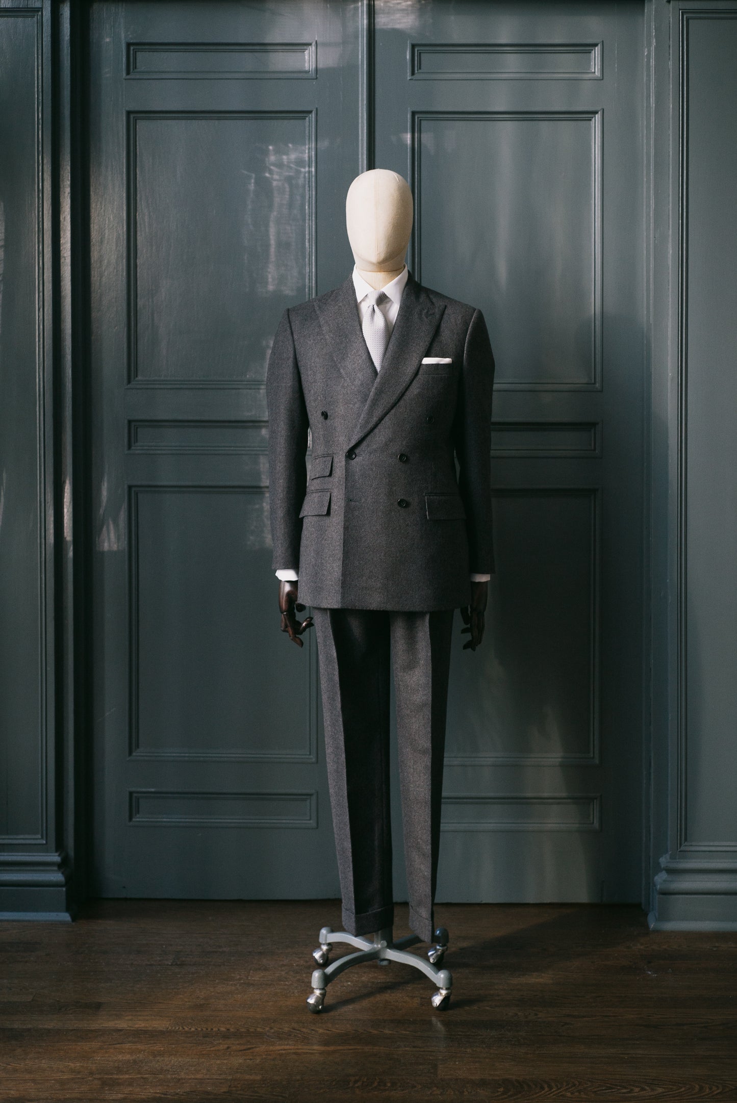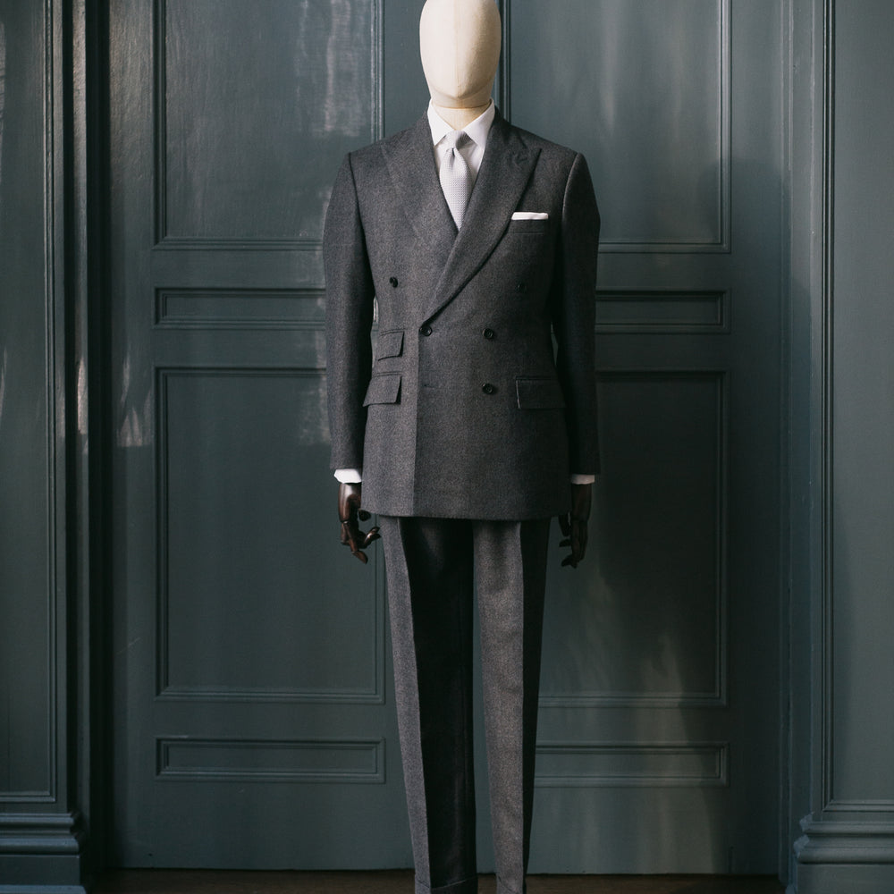 Because we planned this for the Fall season we permitted ourselves to create a similar look in a dark grey flannel from Lovatt (Redpath Flannel fabric 100). Being 14oz or 400grams, it’s the perfect cloth for this time of year. The lapel has 4” or 10cm peak. The trousers have double outward facing pleats and a 2” or 5cm cuff. We paired these with an off white poplin shirt from our house range Firenlust cotton shirt bunch, and opted for double or French cuffs with a semi-spread collar. The look was topped off with a silver grenadine tie.