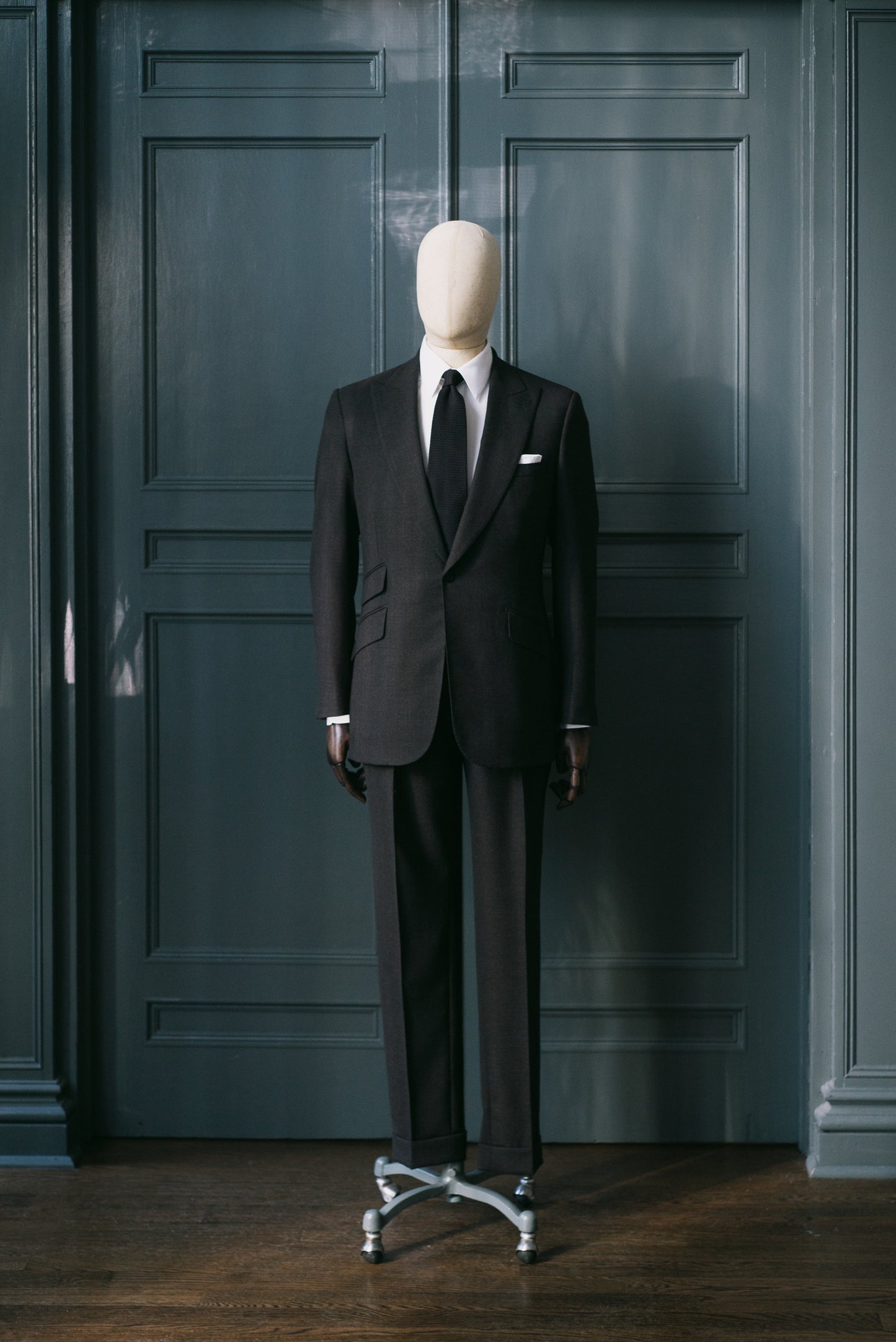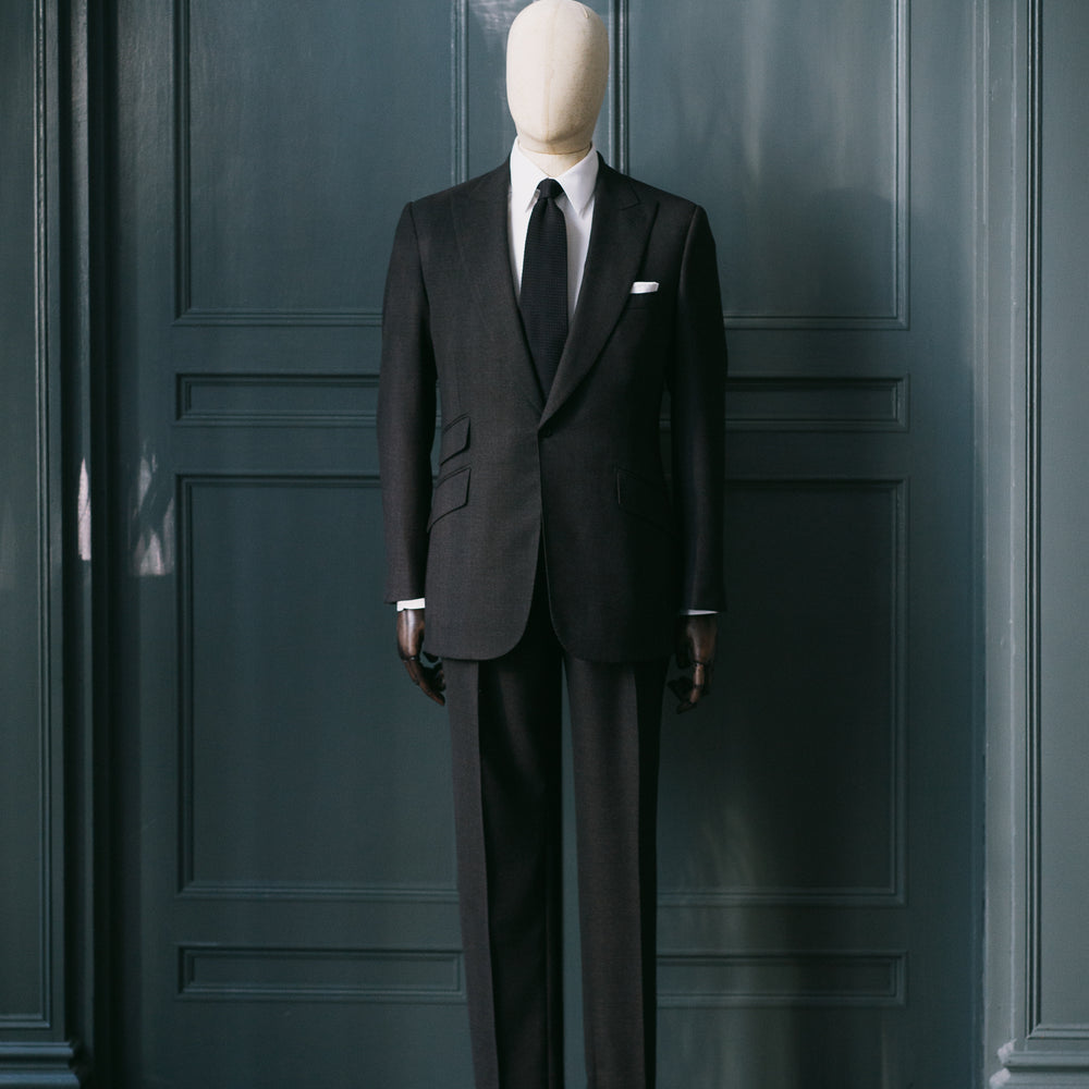 In recreating this suit, we selected a beautiful shade of darker grey that is not quite charcoal, from Dugdale Bros & Co.’s Tropical Breeze collection (1634). It’s a 2-ply high twist fabric that can be worn year round (10oz/290gr) and has a beautiful drape and crisp handle. The design is a one button jacket with 3 3/4” or 9,5cm peaks, with slanted pockets and a ticket pocket. Trousers have side adjusters, a single inward facing pleat and 2” or 5cm cuffs. We paired the suit with a crisp white poplin point collar shirt from our Firenlust cotton shirt bunch and a black grenadine tie to add a more contemporary twist.