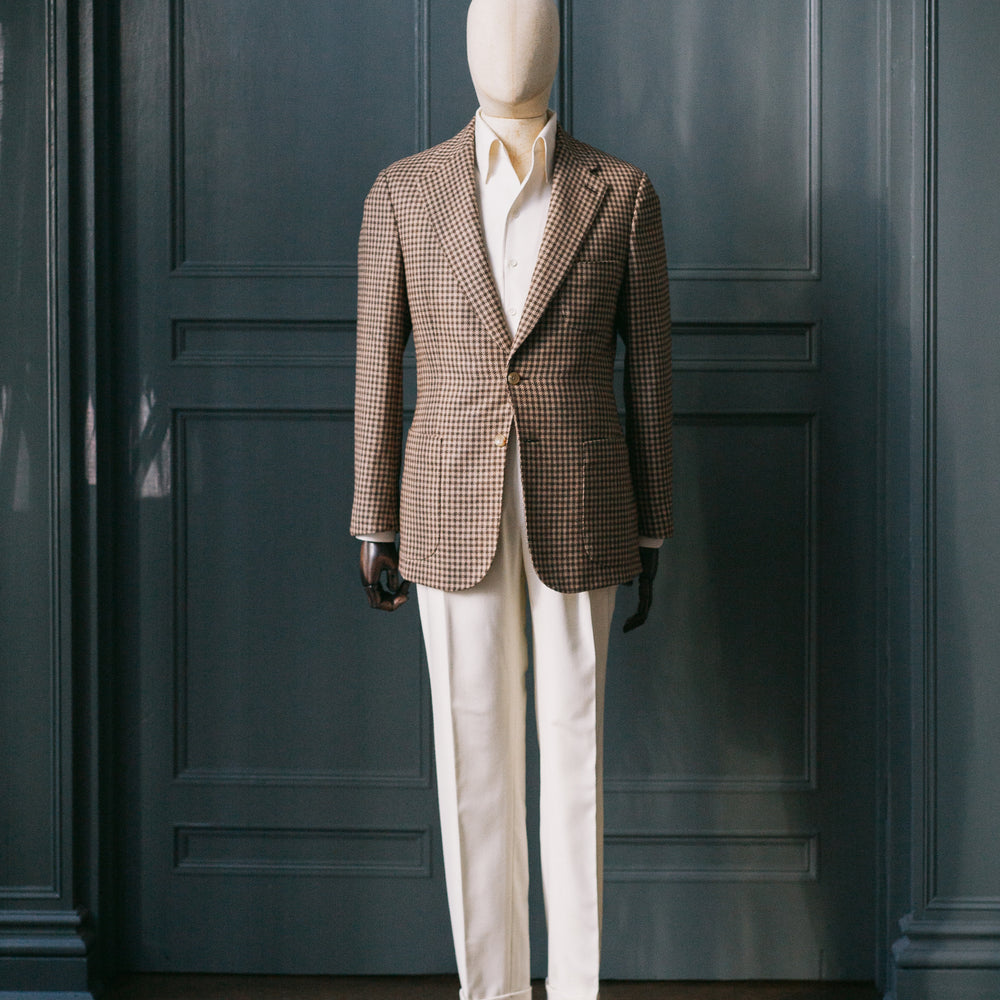 Captured in 1933, this photo shows Cooper outfitted in a sophisticated country look alongside his wife Veronica ‘Rocky’ Balfe. A gun-check sports coat and flannels did the trick then as it still does today. We found the perfect chocolate and caramel gun-check from Lovatt’s Kirkton tweed bunch, (fabric 526), 16oz/500gr, to recreate the triple patch pocket set-up, and combined this with cream trousers cut from Fox Brothers flannel (CL2-5), 14oz/400gr. The trousers feature side adjusters, double inward facing pleats and a 2”/5cm cuff, and are paired with a one-piece hidden button-down collar in an off-white cotton cashmere twill shirt, cut from Thomas Mason shirting fabric (FM56926-2-A) for a relaxed luxurious look.