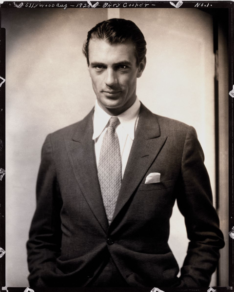 This is a famous Edward Steichen studio portrait from 1928. In it Cooper wears a single breasted peak lapel suit, a white point collar shirt and a patterned tie.