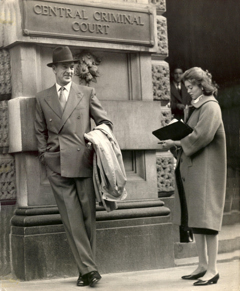 In this photo we see Cooper casually hanging with his daughter Maria in London in 1960, wearing a well proportioned 6x4 classic double breasted suit. Trousers are cuffed and he combines it with a white shirt and solid grey tie.