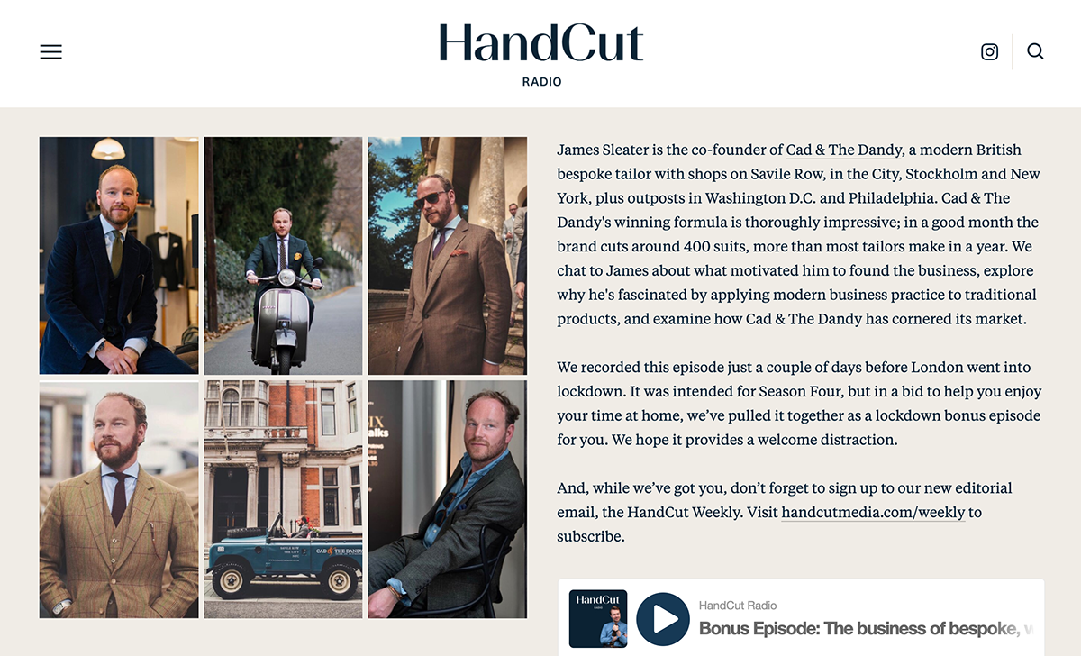 HandCut Radio is a podcast that explores the world of men’s style with industry insiders, aficionados and the most fascinating men and women in the business. In this episode, recorded a few days before the UK went into full lockdown, host Aleks Cvetkovic talks to James about what motivated him to found Cad & The Dandy, explores why he’s fascinated by applying modern business practice to traditional products, and examines how Cad & The Dandy has cornered its market.