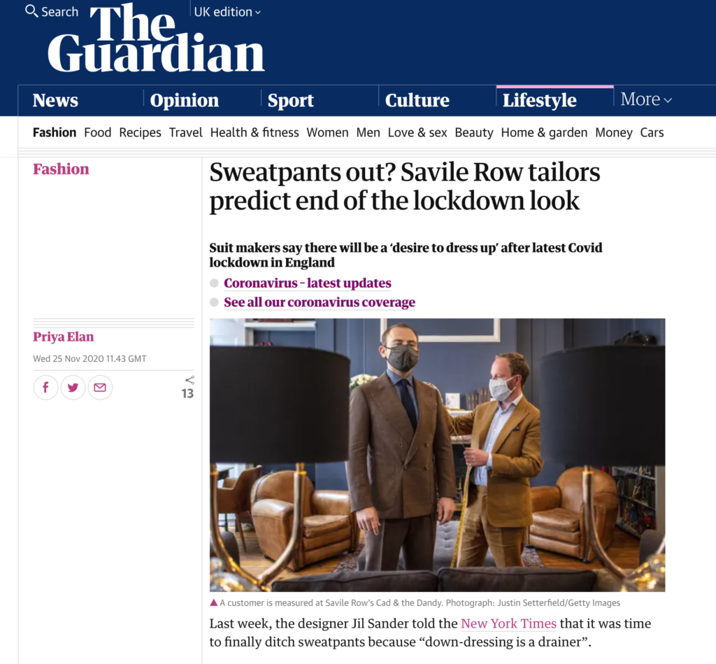Read the full article here – https://www.theguardian.com/fashion/2020/nov/25/sweatpants-out-savile-row-tailors-predict-end-lockdown-look-covid