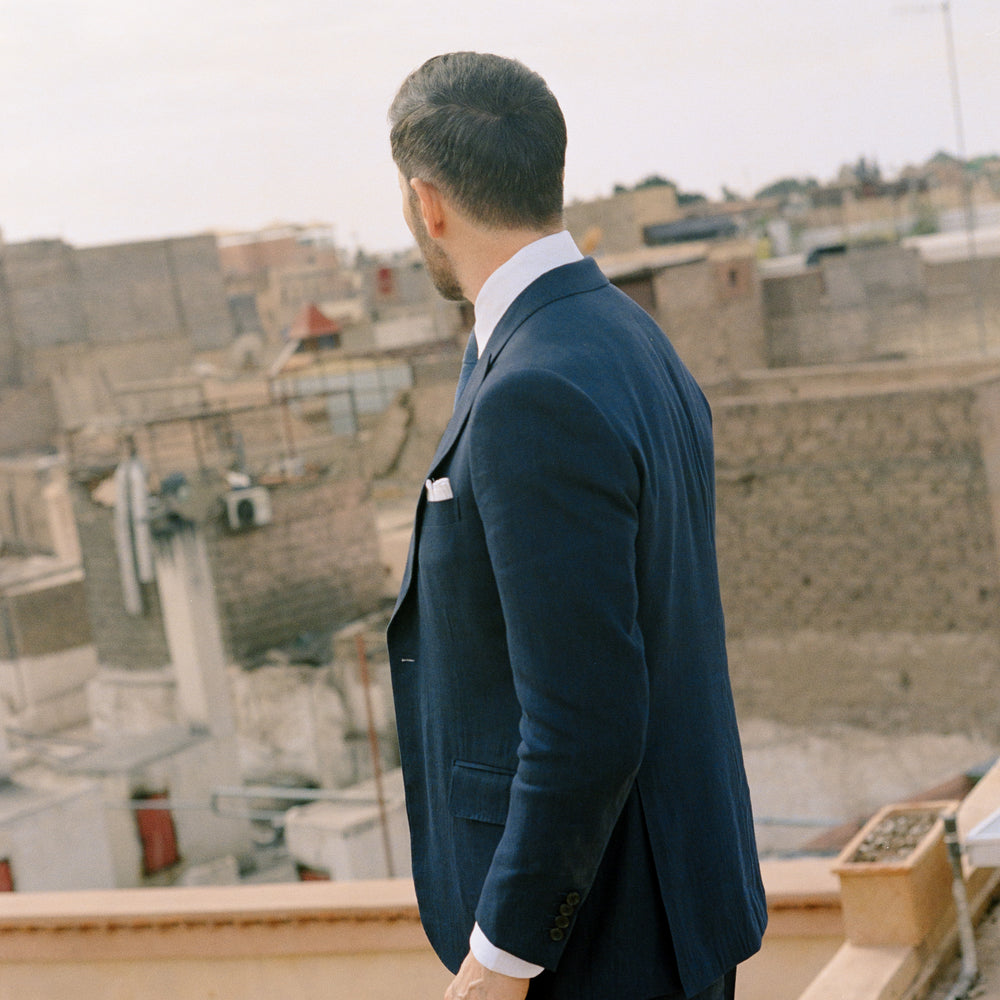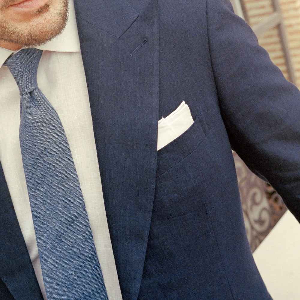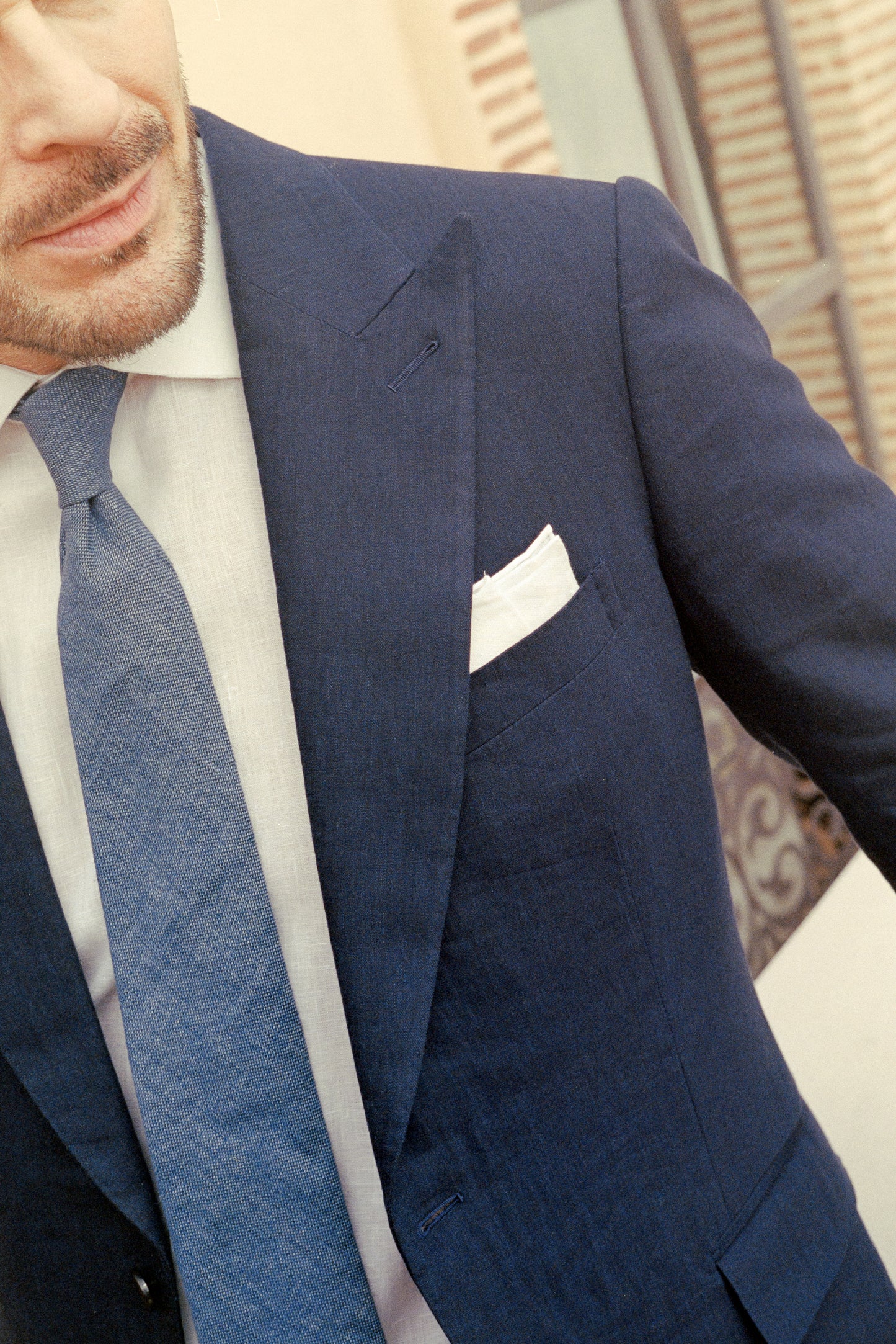 Single Breasted Peak Lapel Suit in Navy Wool Linen
