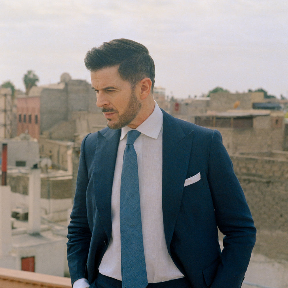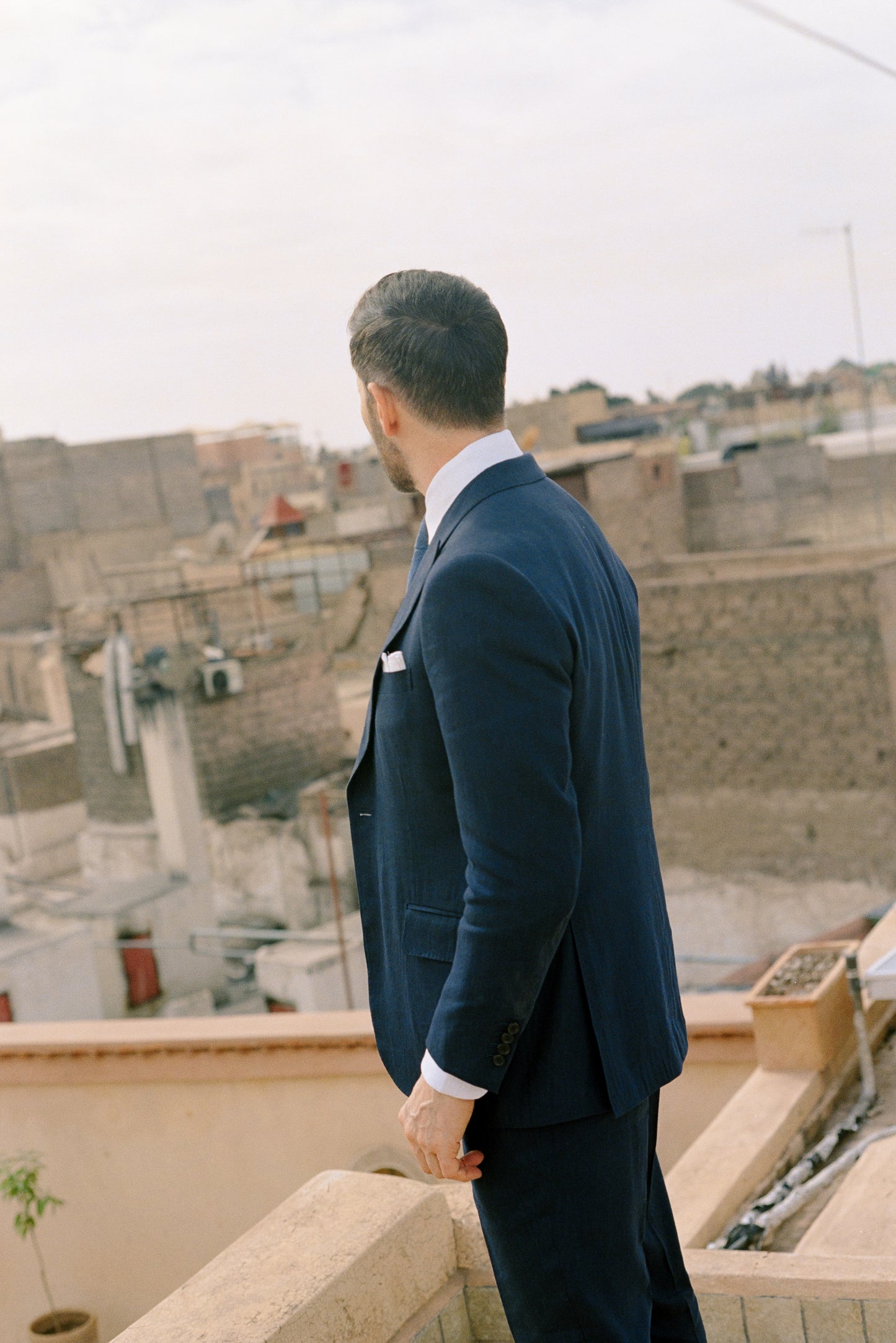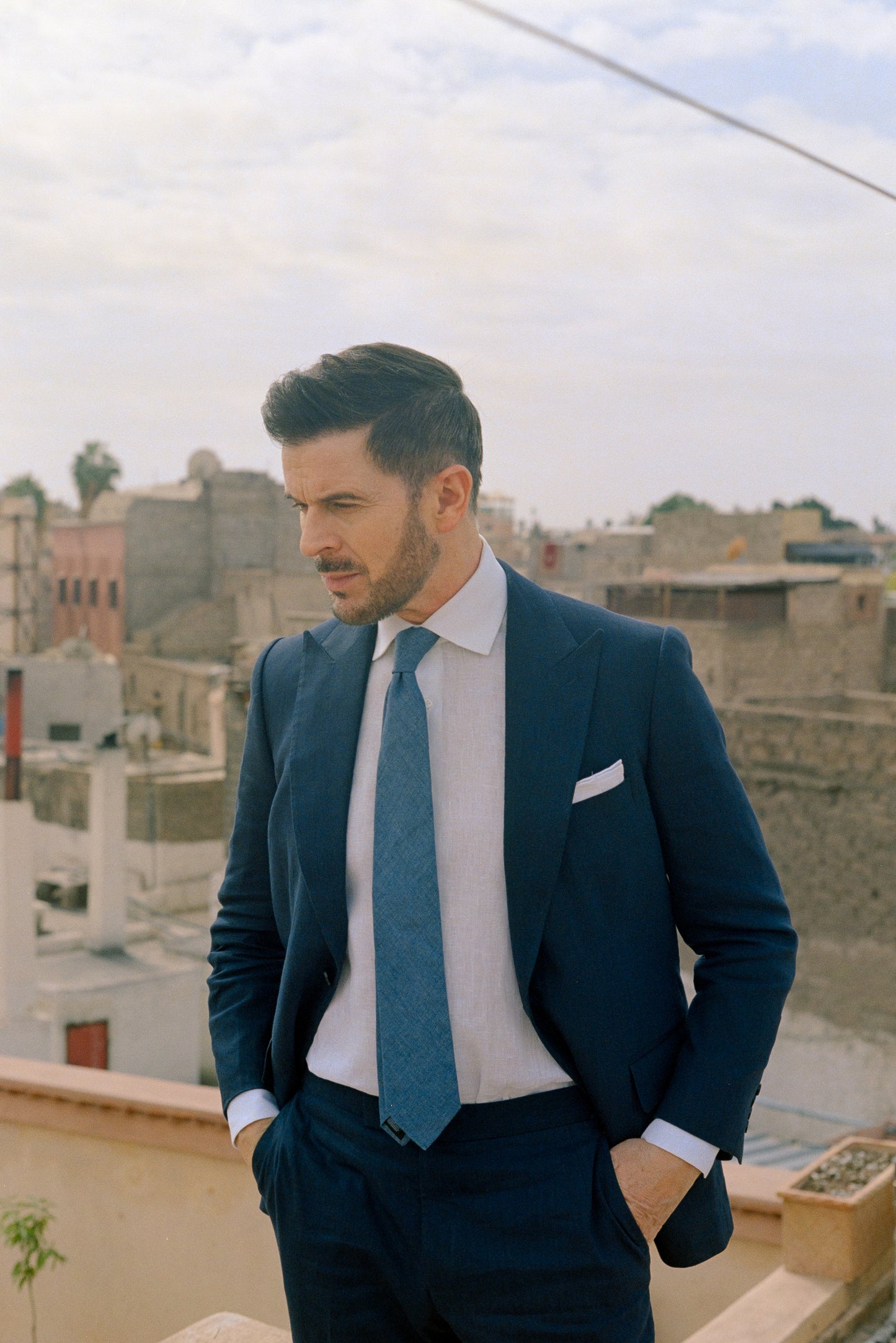 Single Breasted Peak Lapel Suit in Navy Wool Linen